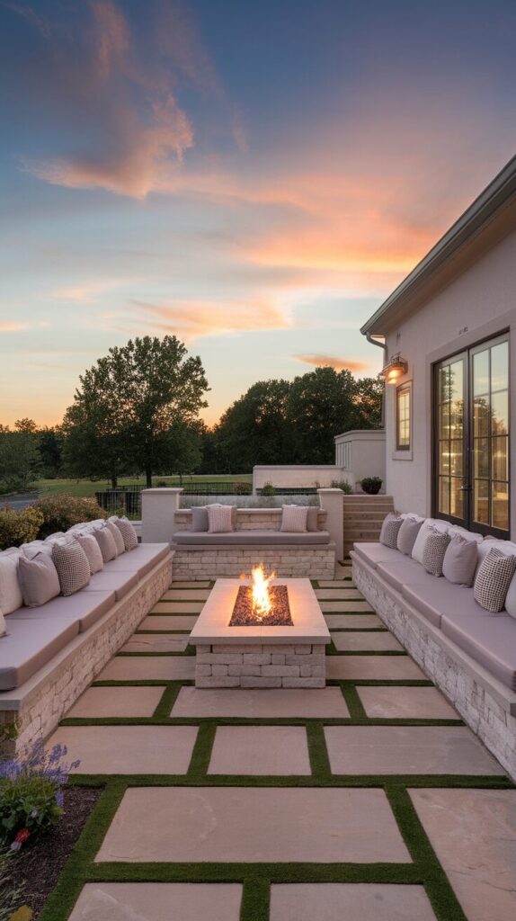 Built-in benches are sleek, space-saving, and seriously underrated. Design them around the patio edge or a firepit, then load up on cushions and throw pillows for comfort.