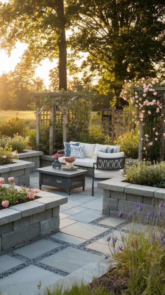 Surround your seating area with flower beds or raised planters, and use trellises and arches for climbing plants like jasmine or roses.