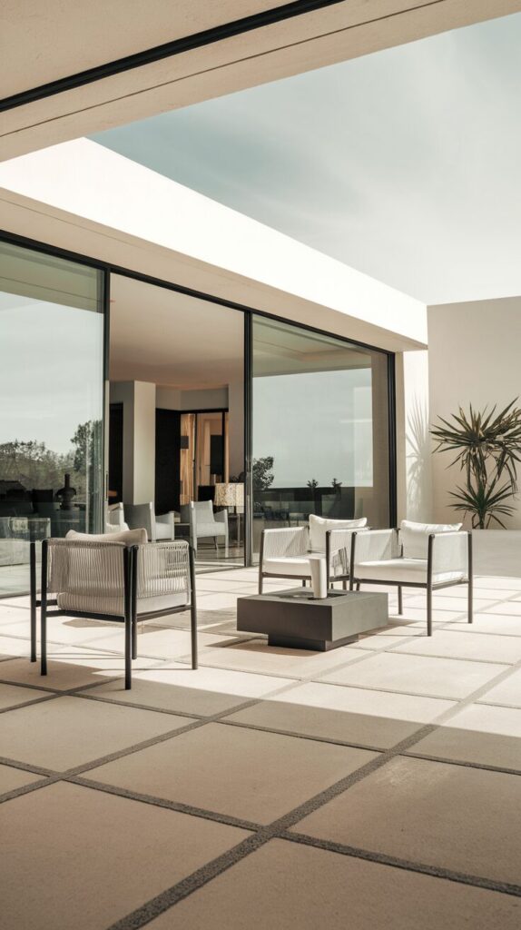 If clutter gives you hives, you’ll love the clean and sleek minimalist patio look. Stick to neutral tones, simple lines, and matte black or concrete furniture for that timeless aesthetic.