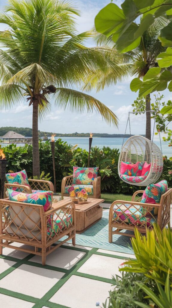 Turn your patio into a mini island vacation spot 🌴. Add bamboo or wicker furniture, bright cushions, and a few palm or banana plants to get those tropical feels.