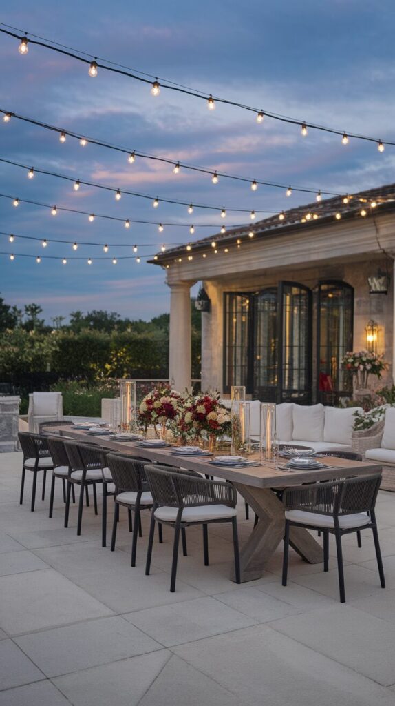 Love hosting dinner outdoors? Set up a full-sized dining table with weatherproof chairs, and hang string lights or even a small chandelier overhead for instant elegance.