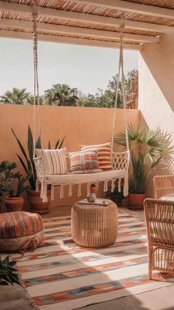 If you love color, texture, and all things artsy, Boho is your playground. Mix macramé swings, woven poufs, rattan chairs, and layered rugs for a carefree, creative space.