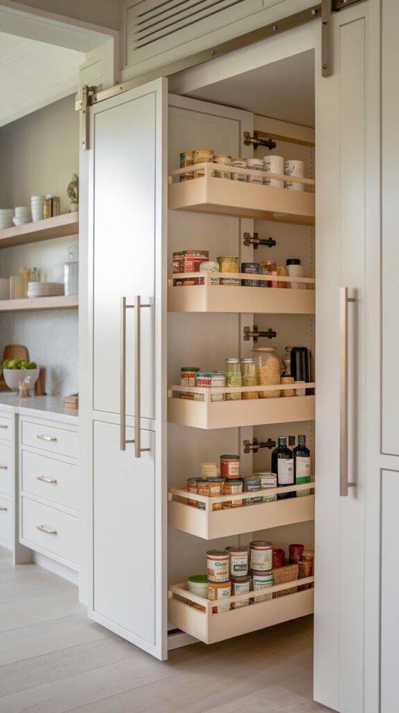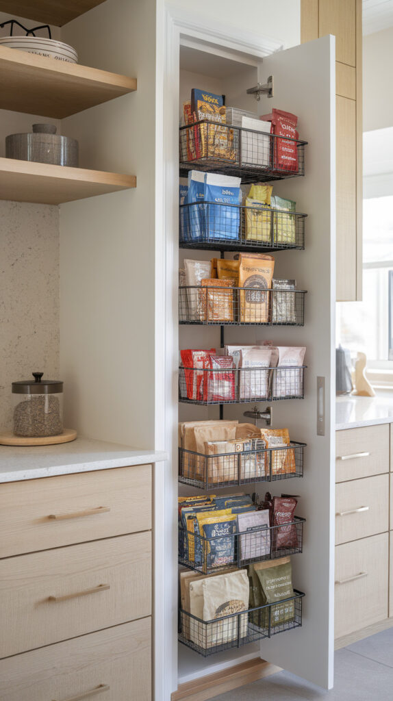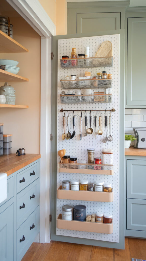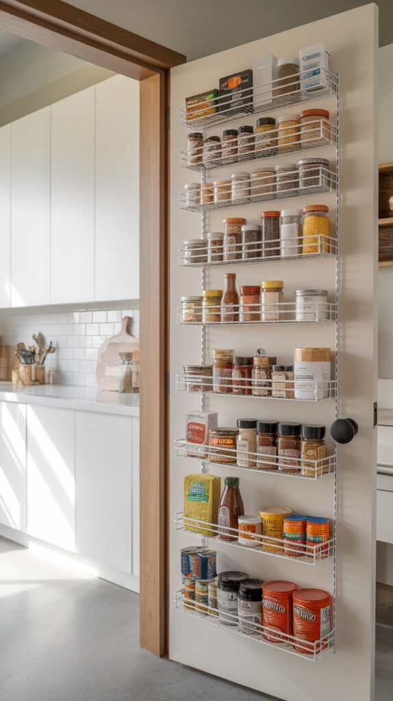 The edges of the pantry door can support slim racks or hooks. Measuring spoons, kitchen scissors, or small tools can live here.