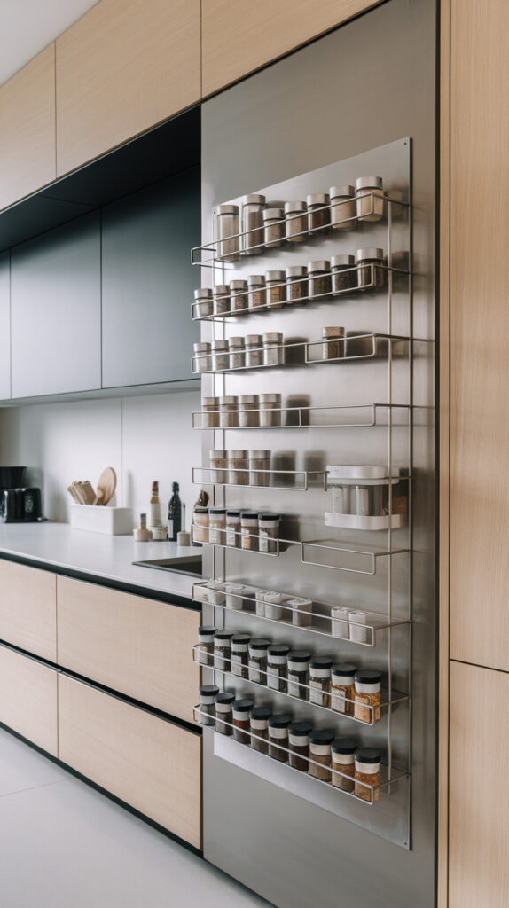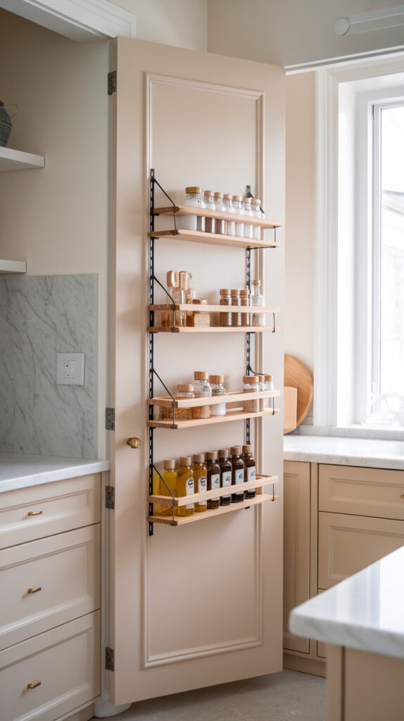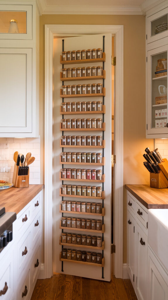 A spice rack on the pantry door keeps everything visible and easy to reach.