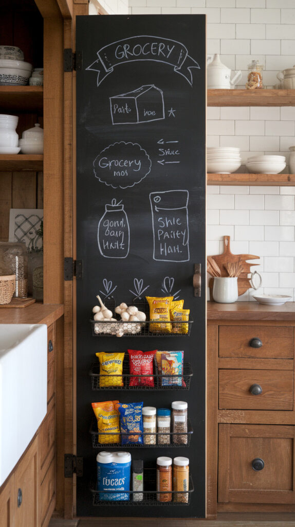 A pantry door can double as storage and a planning board. A chalkboard organizer turns that door into a grocery list hub while still holding small items.