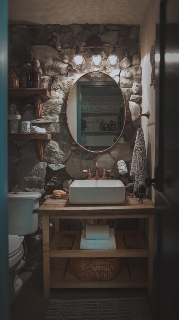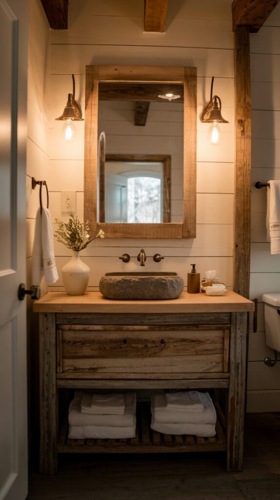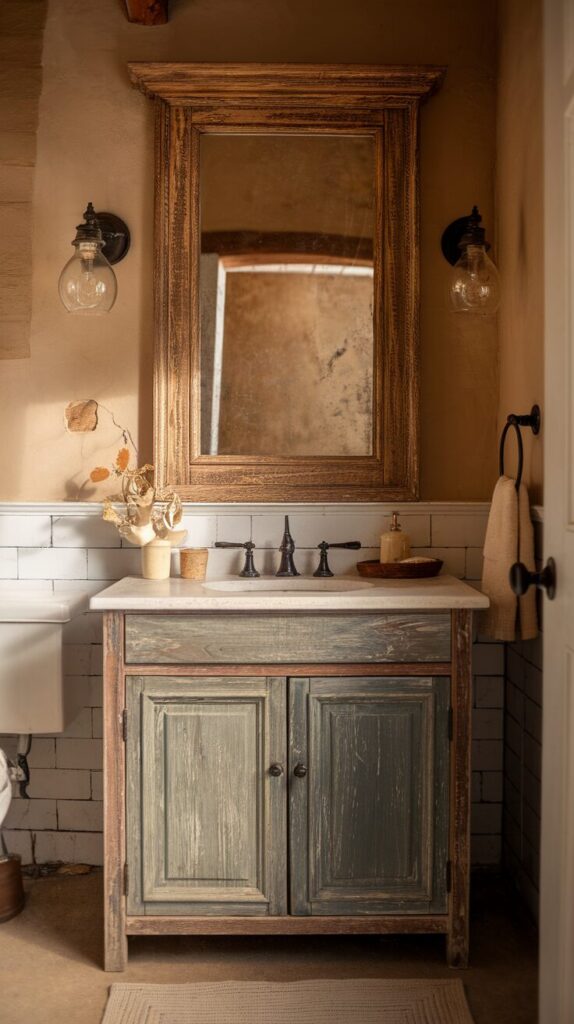 Think weathered wood, vintage mirrors, and soft earthy tones—like stepping into a country cottage every time you wash your hands.