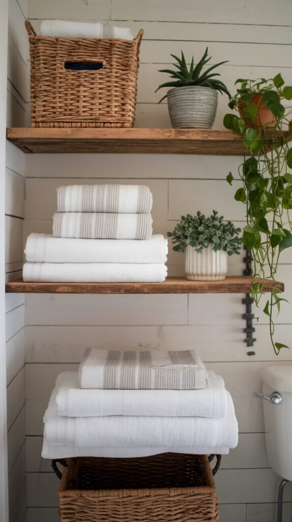 Use baskets, jars, or neatly folded towels to keep things organized and stylish. You’ll love how the shelves keep essentials within reach while doubling as display space.