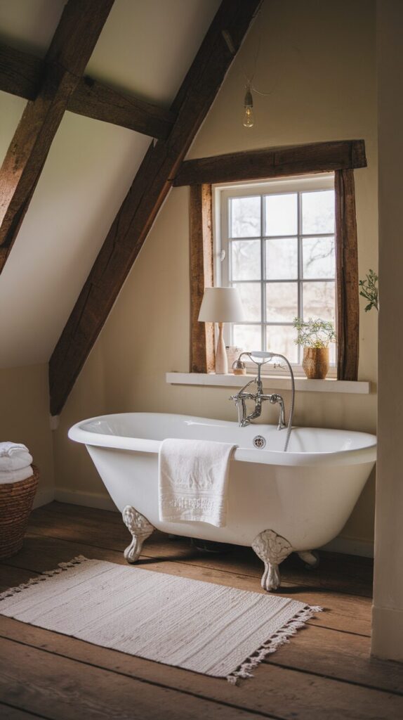 The beams add texture, warmth, and architectural interest. Pair them with neutral walls and soft lighting, and your bathroom suddenly feels like a spa tucked away in the countryside.