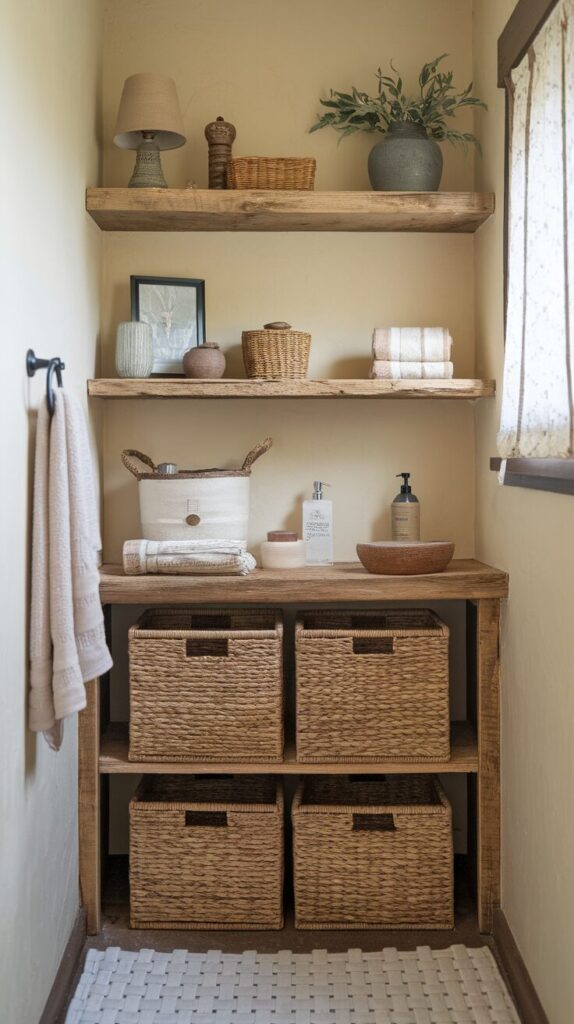 Use them for towels, toiletries, or even laundry—keeping clutter tucked away in style. Their earthy tones blend seamlessly with rustic wood and stone.