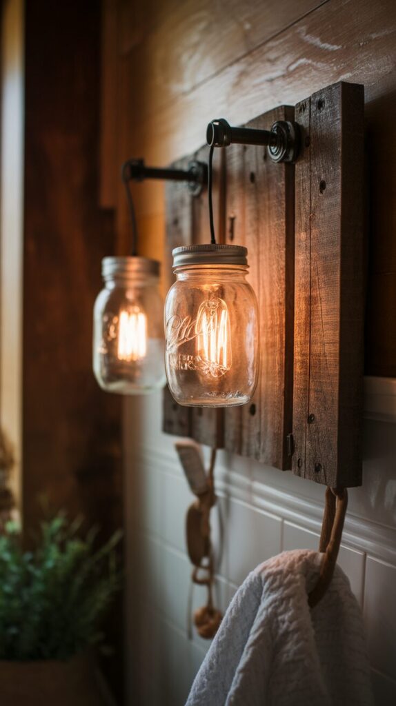 DIY projects like pallet shelves or mason jar lighting can reduce costs while adding personality. Just make sure materials are sealed properly for moisture protection in bathroom environments.