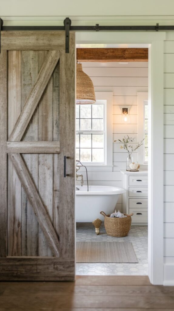 These doors are especially handy in small bathrooms where every inch counts. Choose a weathered wood finish for an authentic rustic vibe, or paint it a muted shade like sage or cream for a softer touch.
