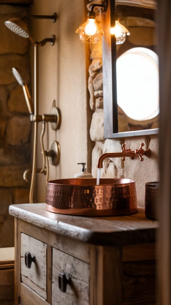 Sometimes it’s the smallest details that make the biggest difference. Copper or brass fixtures bring a warm, aged look that pairs beautifully with wood and stone.