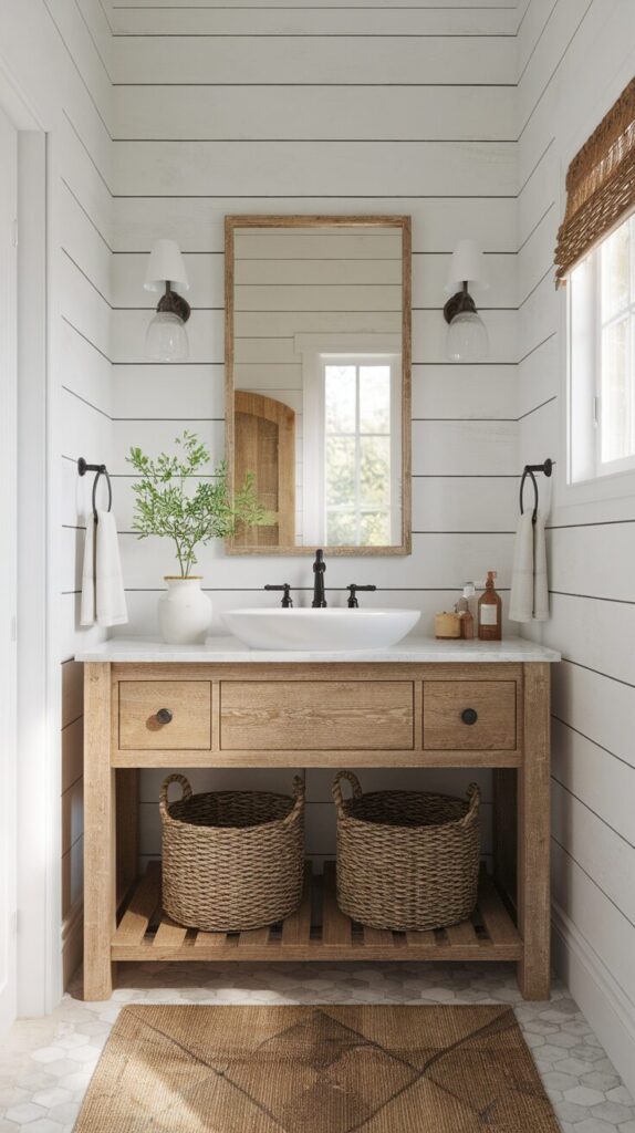 Place a pair of sconces on either side for a cozy, balanced glow. Suddenly, your bathroom looks less like a utility space and more like a country-chic sanctuary.