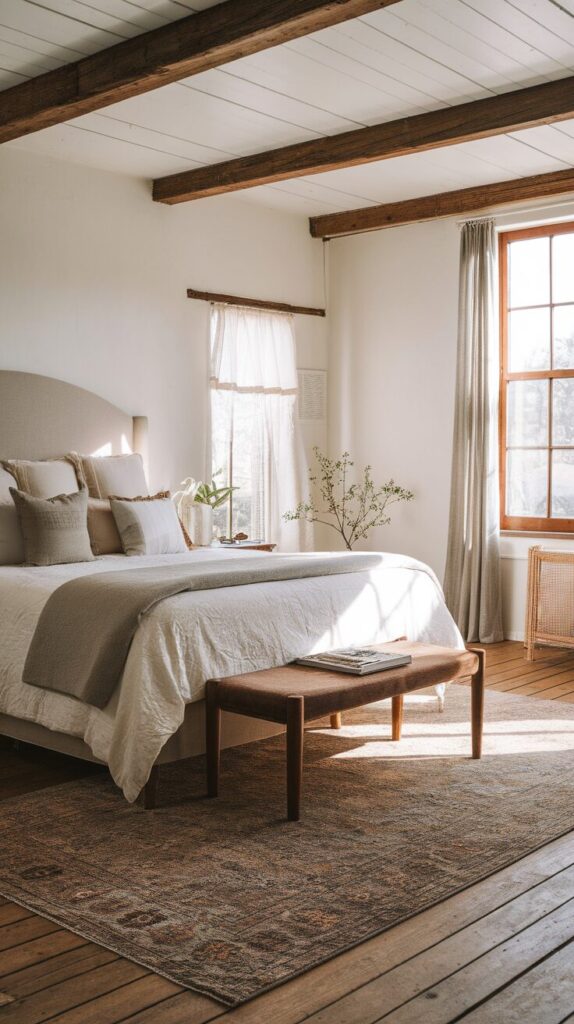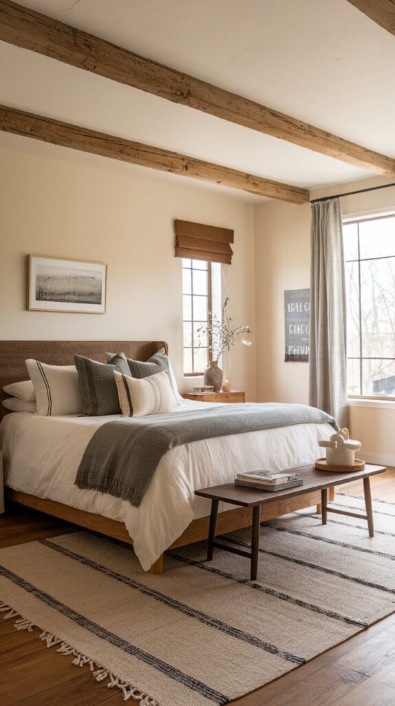 I used to think rustic meant dark and heavy. Neutral bedding changed my mind completely. Soft layers made the room feel calm instead of cluttered.