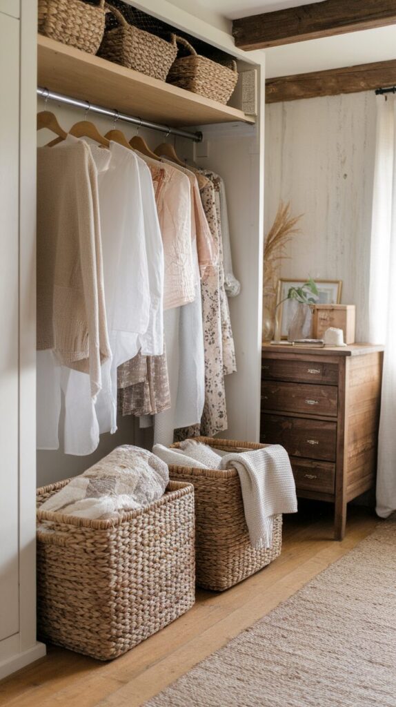 Mix fabrics instead of matching sets. Linen, cotton, and wool play well together. Skip shiny or silky materials, because they clash with rustic warmth.