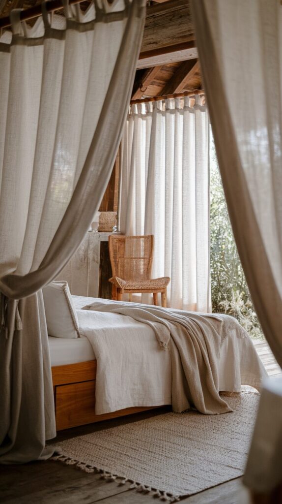 Rustic bedrooms feel best with natural light. Linen filters light gently. It adds texture without heaviness.