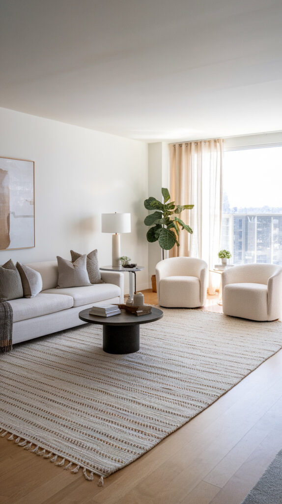 A large rug visually connects furniture pieces into one cohesive unit. It defines the seating area clearly, especially in open-concept apartments.
