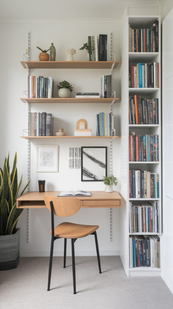 - Install floating shelves above desks or sofas.
