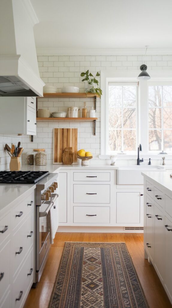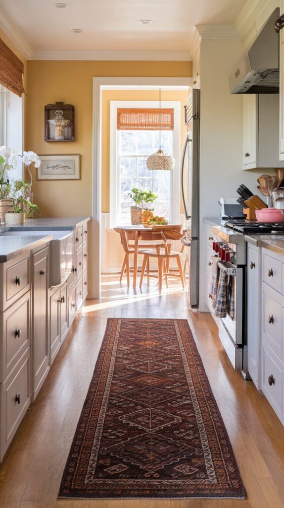 A rug visually anchors the kitchen and softens hard surfaces. It also absorbs sound and reduces echo. This small addition makes the space feel finished instead of purely functional.