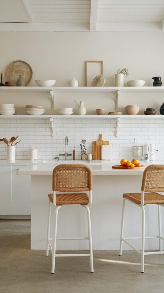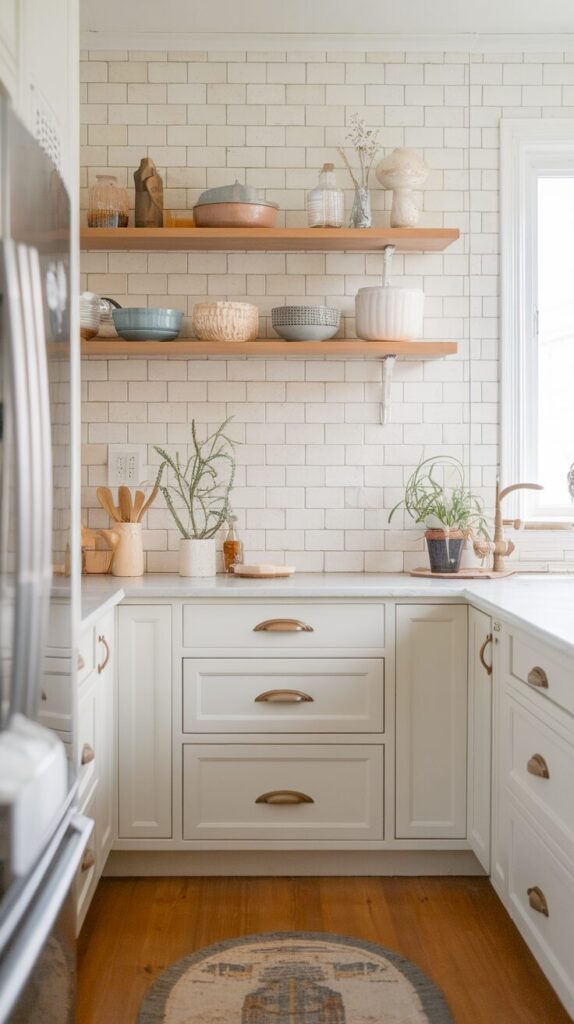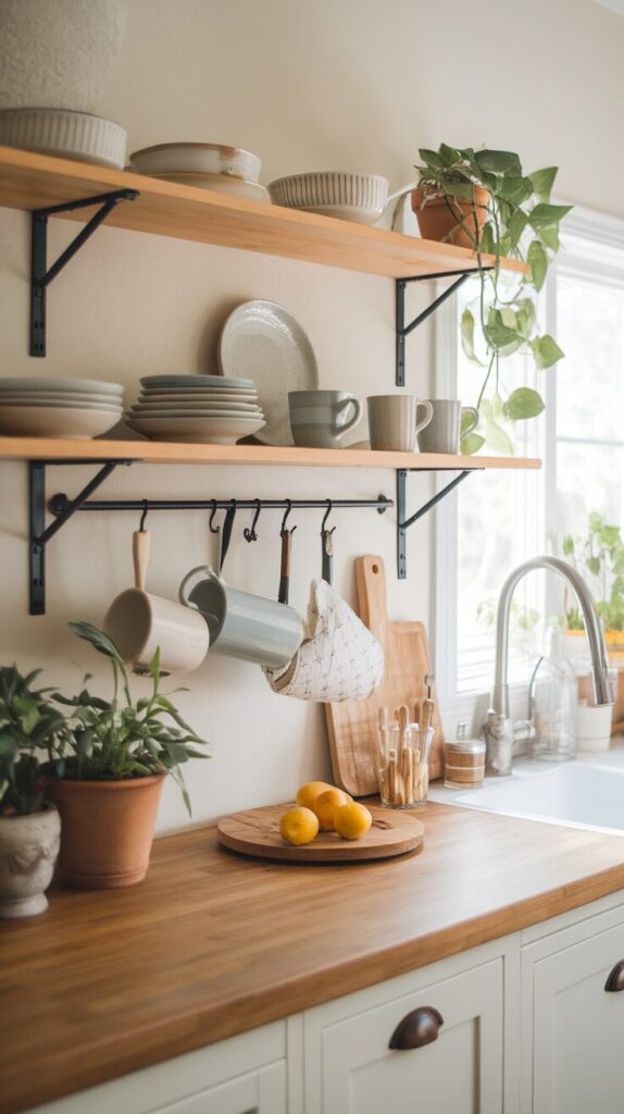 This idea upgrades both style and convenience. Open shelves break up heavy cabinetry and make kitchens feel lighter. They also force you to curate, which helps reduce clutter naturally.