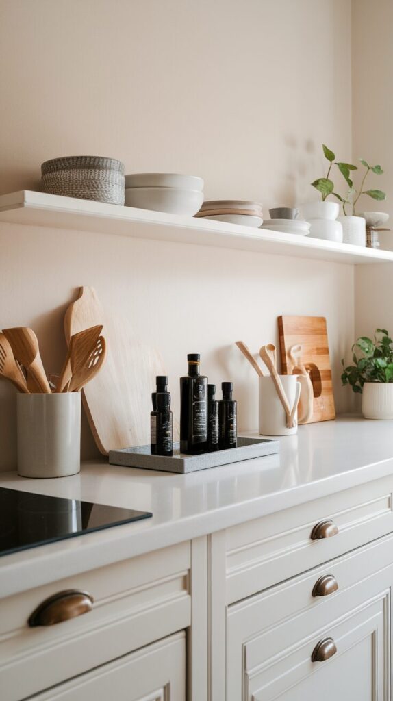 Use matching containers for oils and utensils. Keep negative space between zones. Avoid lining items along the backsplash like a display shelf.