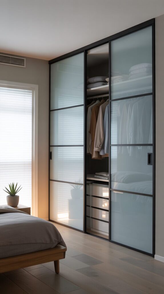 If mirrors aren’t your style, frosted glass is a fantastic option. It keeps things feeling light and airy while still giving you a bit of privacy for whatever’s inside your closet.