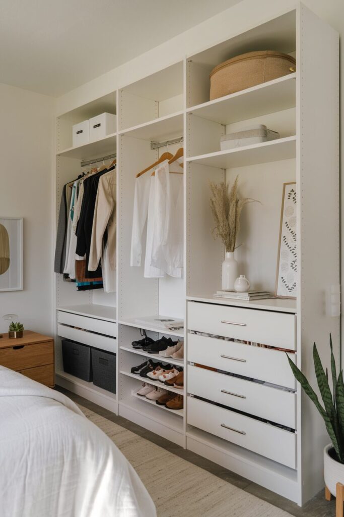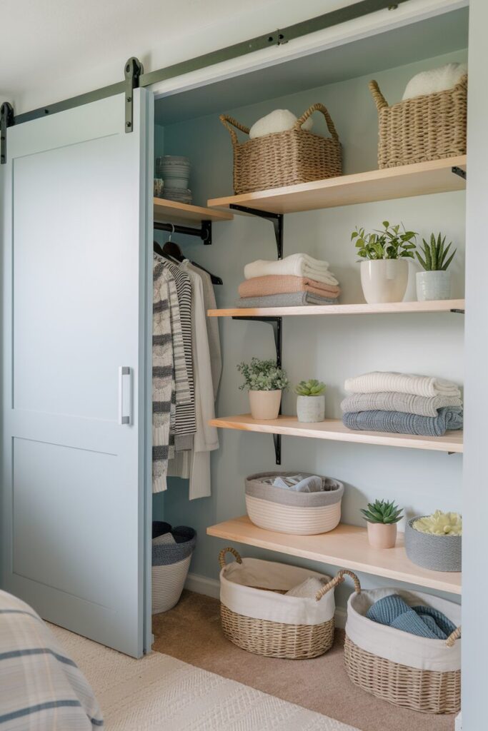 To add personality, style your shelves with a few decorative touches. A small plant, framed photo, or piece of art can make your closet feel more like part of the room rather than just a storage zone.