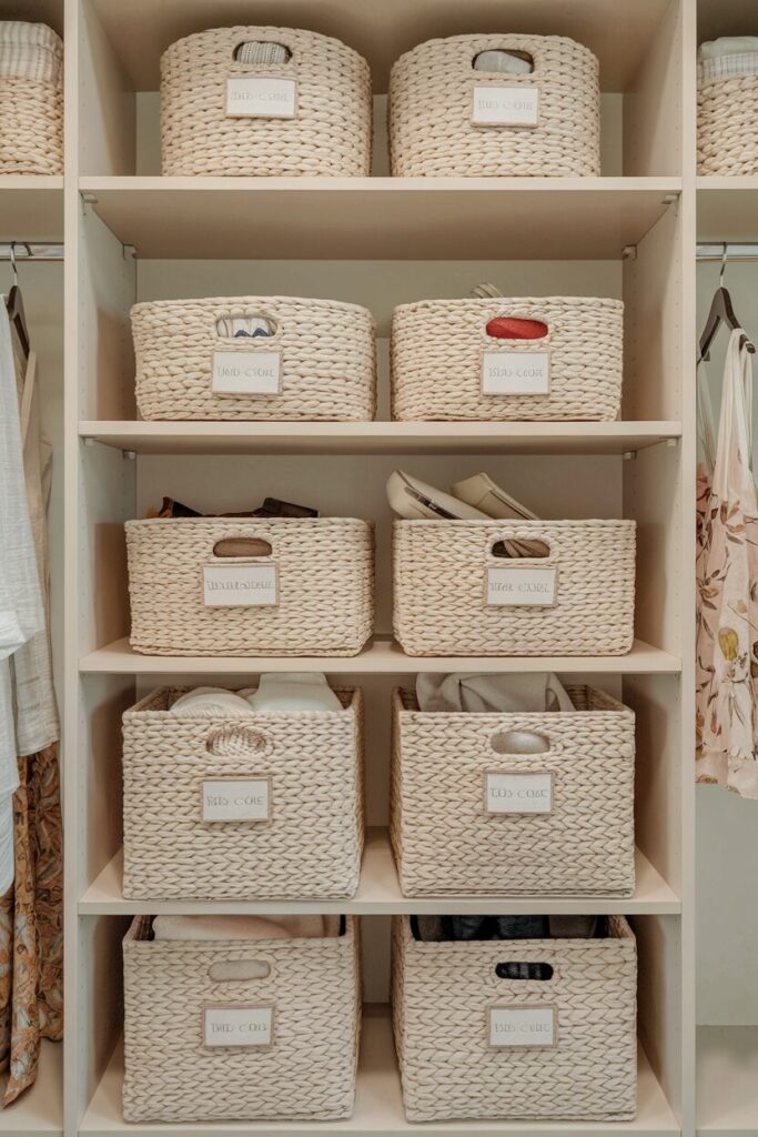 Using matching bins creates a clean, cohesive look that instantly makes your closet feel more organized. It’s like giving everything a designated “home.”
