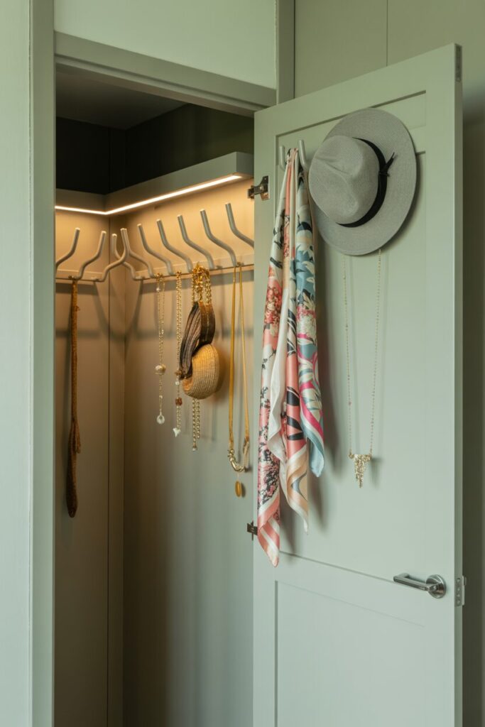 The inside of your closet doors is often overlooked, but it’s prime space for hidden storage. Adding slim racks, hooks, or shallow shelves can transform it into an accessory station.