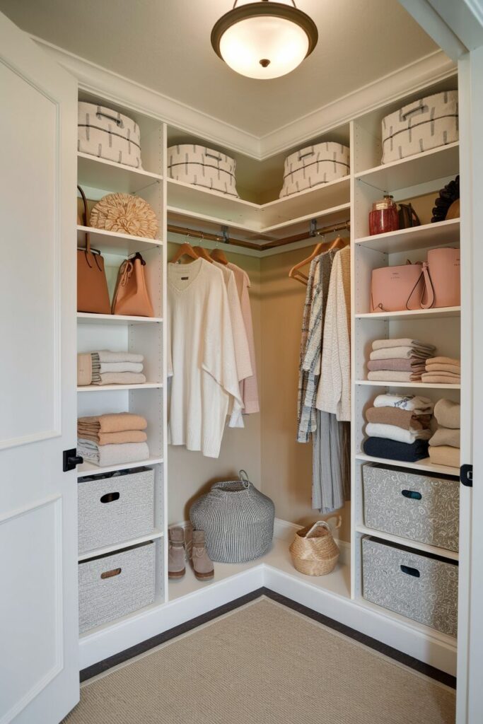 Corners are often wasted space in closets, but adding corner shelving turns them into storage gold. L-shaped shelves fit neatly into the space without blocking your main closet area.