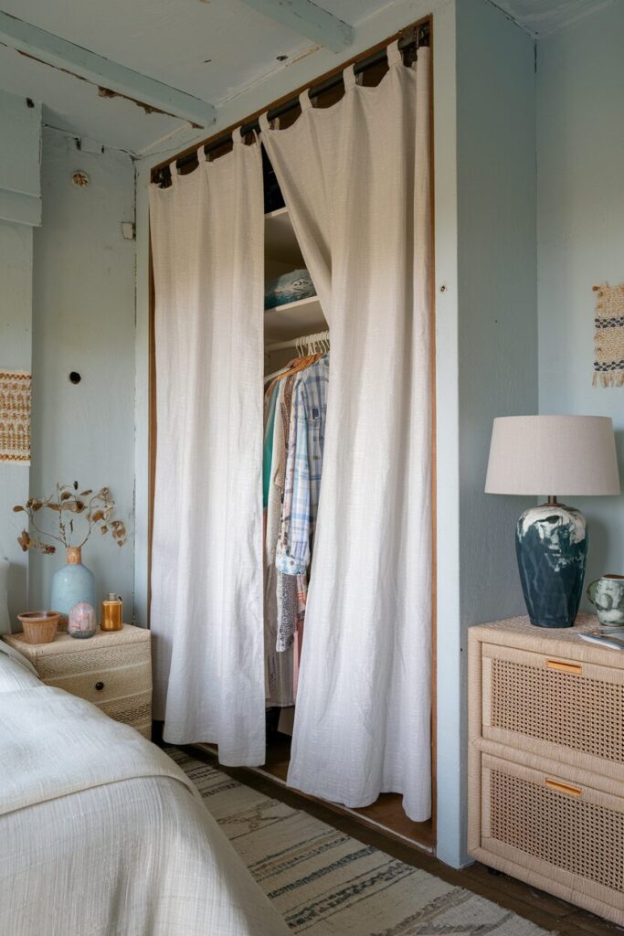 Replacing closet doors with a curtain is a budget-friendly, renter-approved solution that instantly changes the feel of your room. Curtains take up less space than swinging doors and are easier to move.