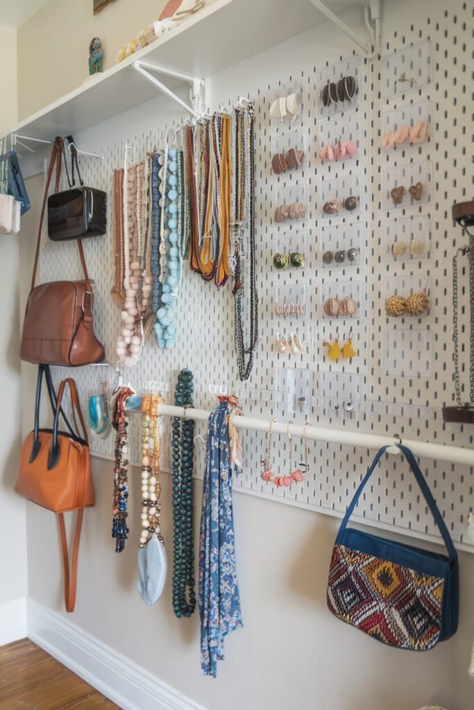 Transform a blank wall in or near your closet into a jewelry and accessories station. Pegboards, mounted hooks, or small shelves keep everything organized and within reach.