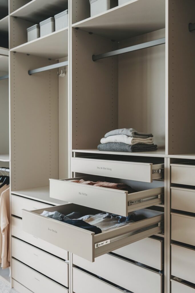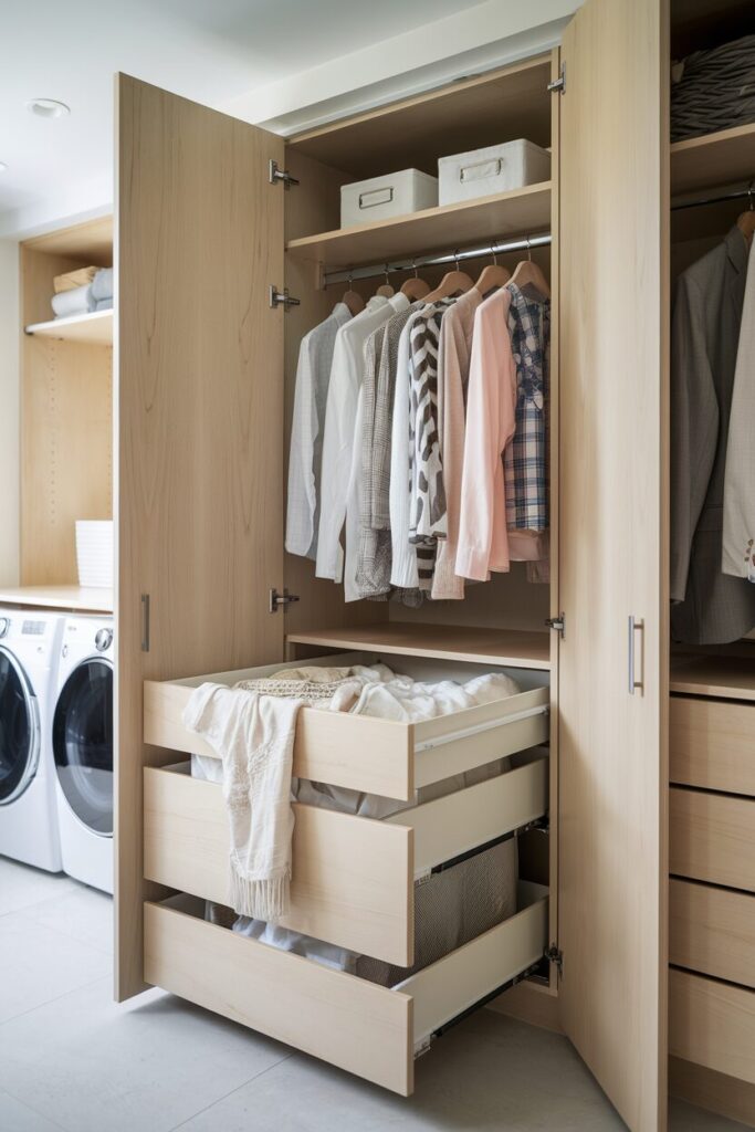 Pull-out drawers also work well in combination with open shelving or hanging rods. You get the best of both worlds — easy access to everyday items and a sleek, tidy appearance.
