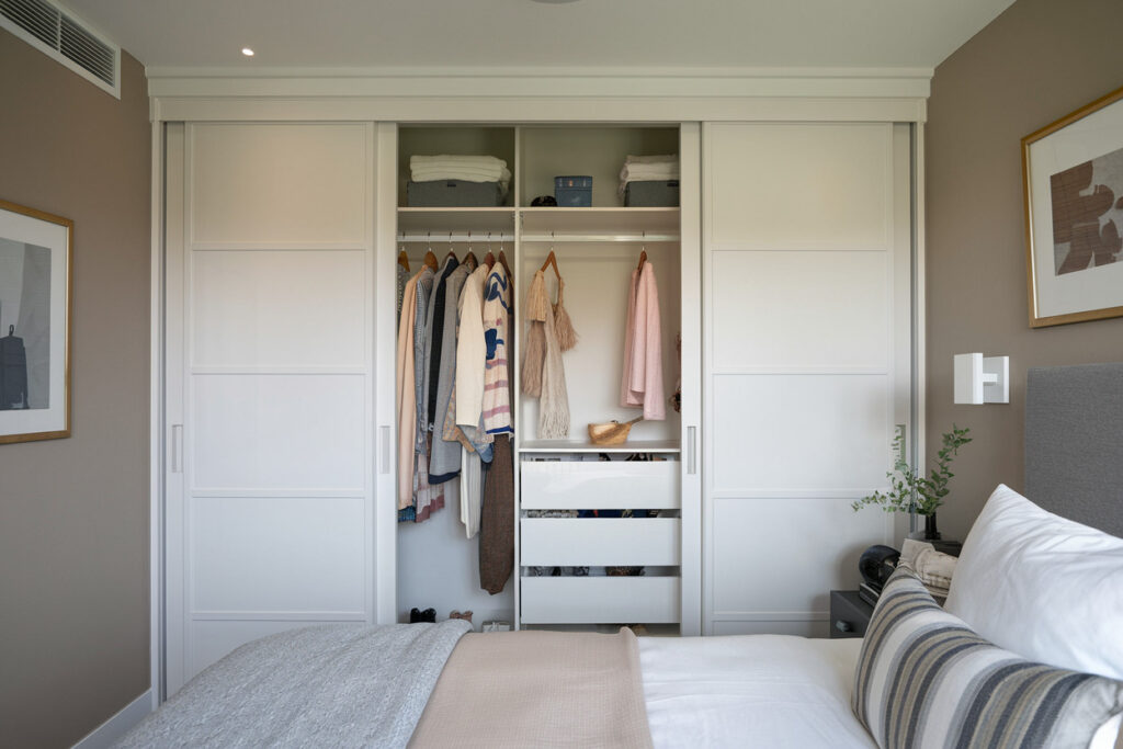Think mirrored wardrobe panels that make the room feel bigger, pull-down rods for unreachable heights, and baskets that keep everything neat and dust-free.