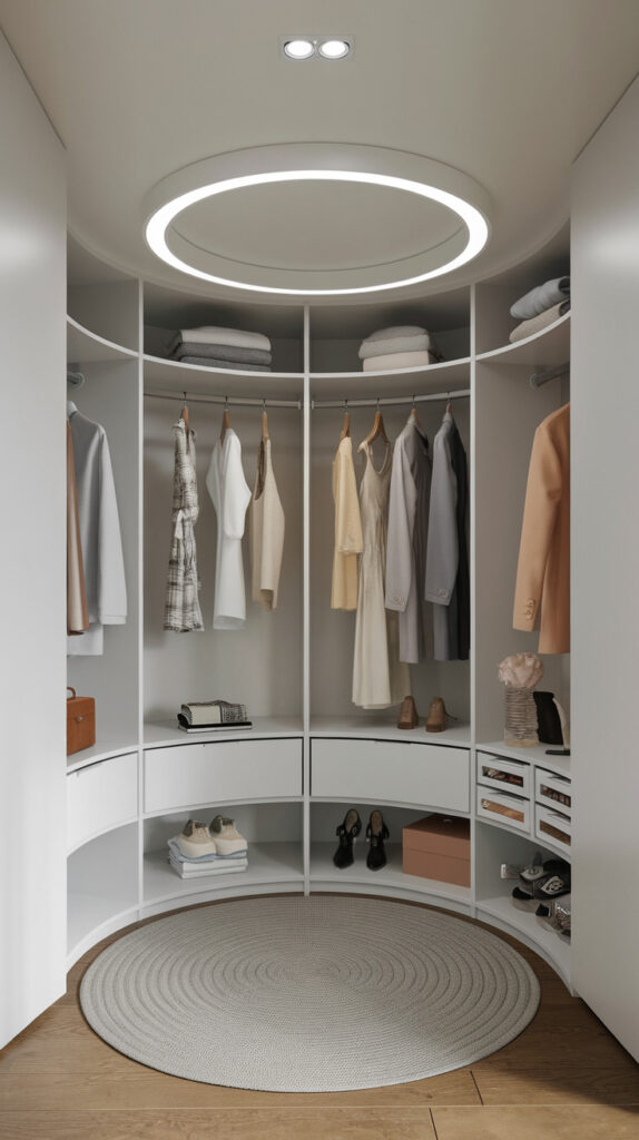 If you’re short on space but love easy access, a rotating closet carousel can be a game-changer. This clever system uses a circular track to rotate clothes with a simple push or button.