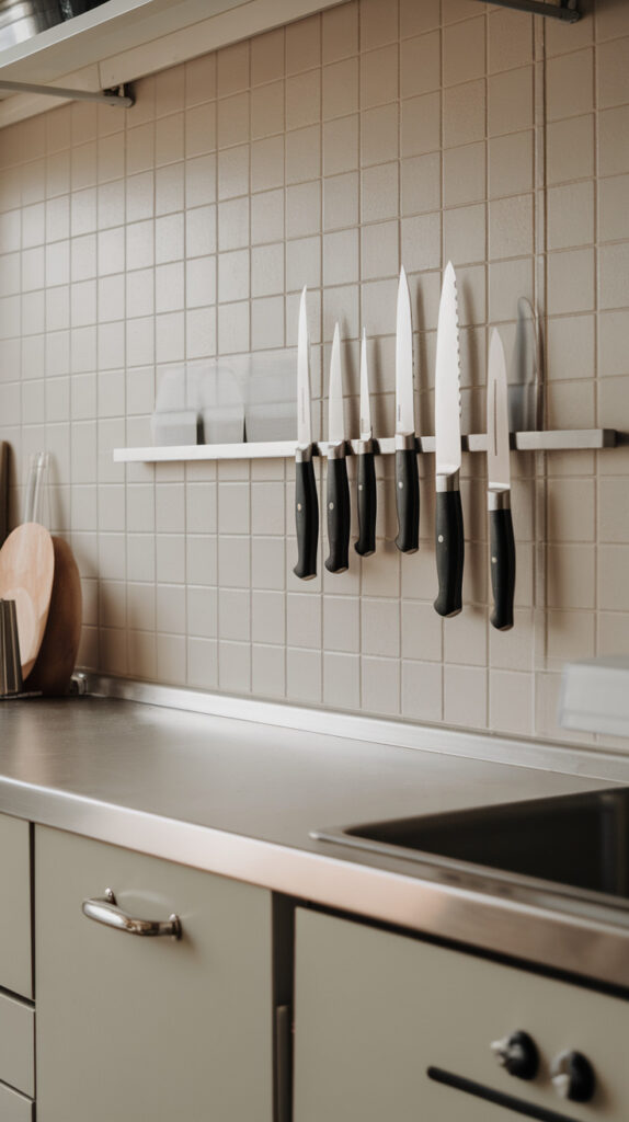 Vertical storage keeps essentials accessible without crowding work surfaces. It also keeps knives dry and visible, which extends their lifespan.