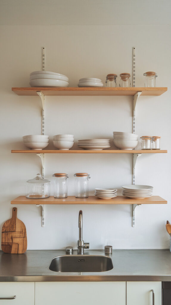 Open shelves work well when you’re disciplined about what you display. If you tend to accumulate mismatched items, closed cabinets may keep things looking cleaner.