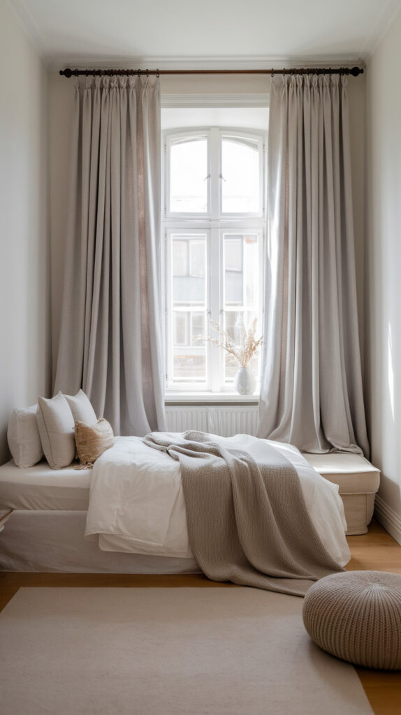 Short curtains shrink rooms visually. Hanging curtains higher and wider stretches the eye upward and outward.