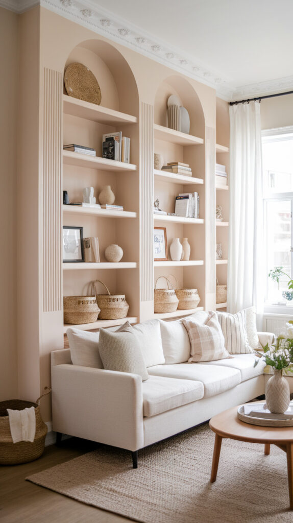 Blending shelves with the wall color makes them feel built-in instead of bulky. That subtle trick changes everything.