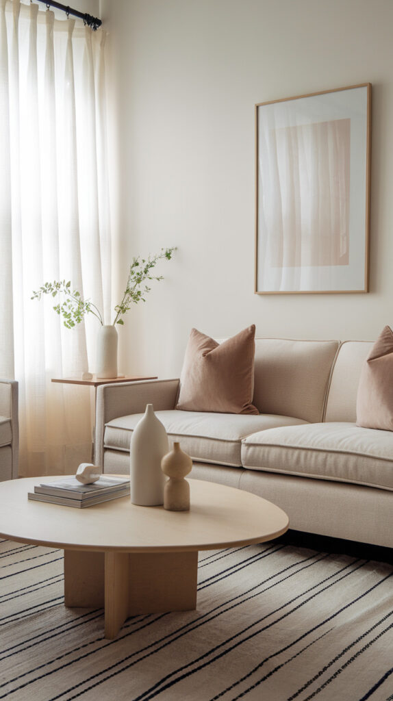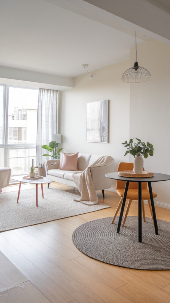 Commit to a consistent color story. Repeating 2–3 main tones across furniture, rugs, and accessories creates cohesion, which naturally makes small rooms feel larger.