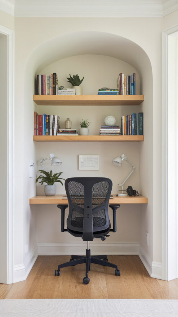I installed two narrow shelves above my desk, and suddenly paperwork had a home. The room felt organized instead of overwhelmed.