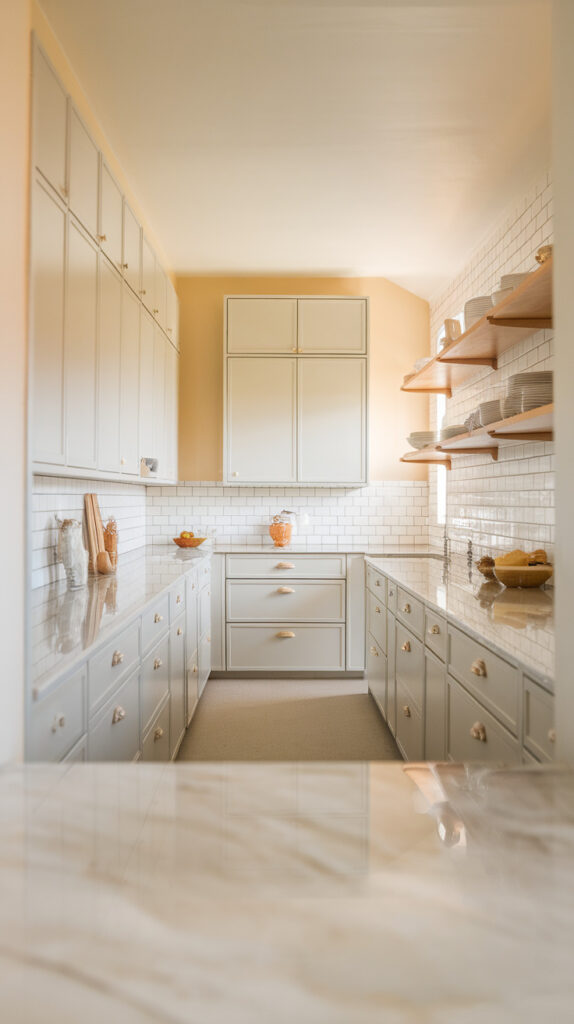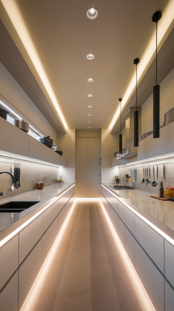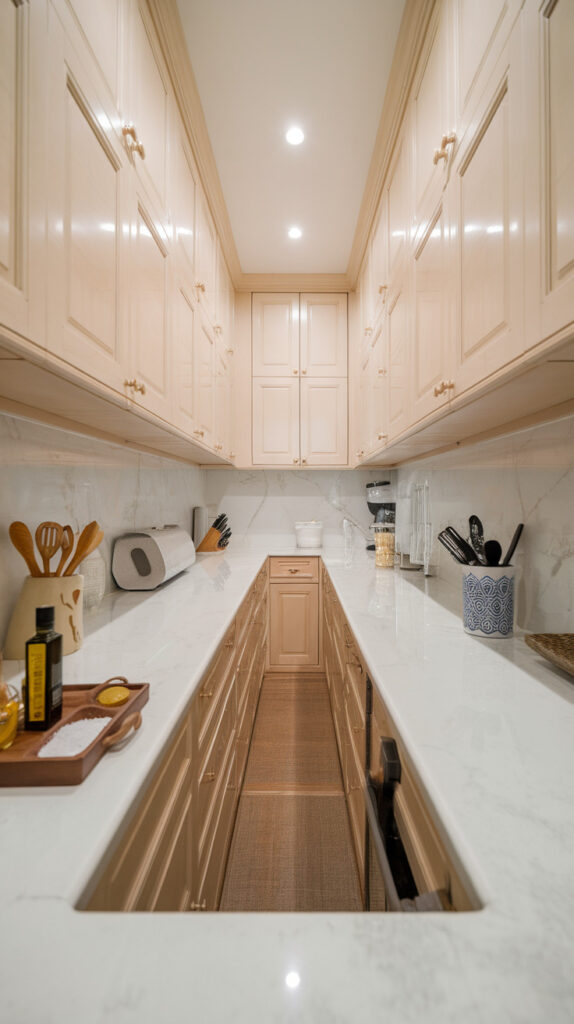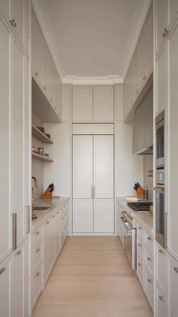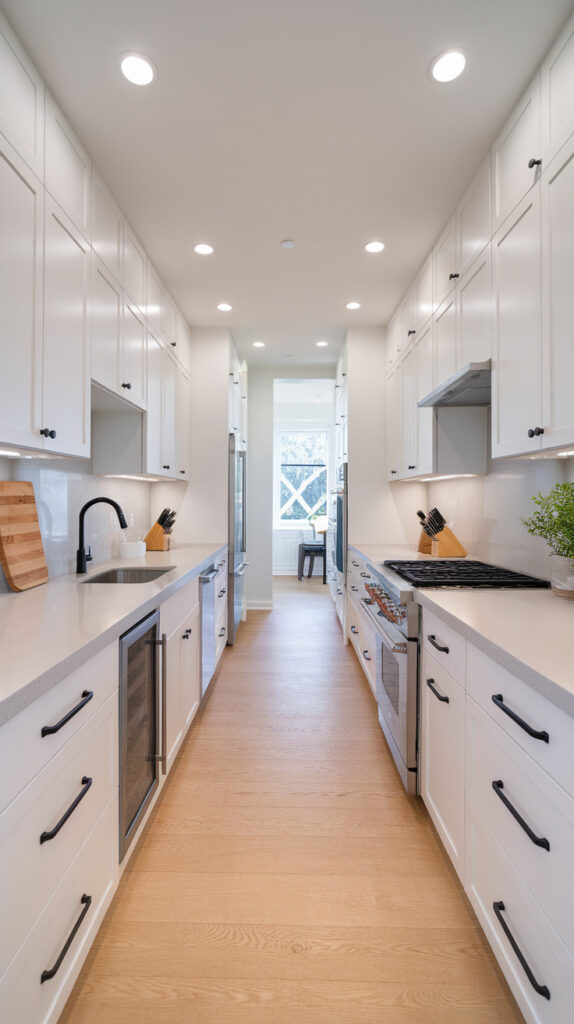 A clean galley layout—cabinets and appliances on both sides with a clear walkway in the center—keeps everything efficient. I’ve seen narrow kitchens instantly feel more functional just by committing to symmetry instead of fighting it.