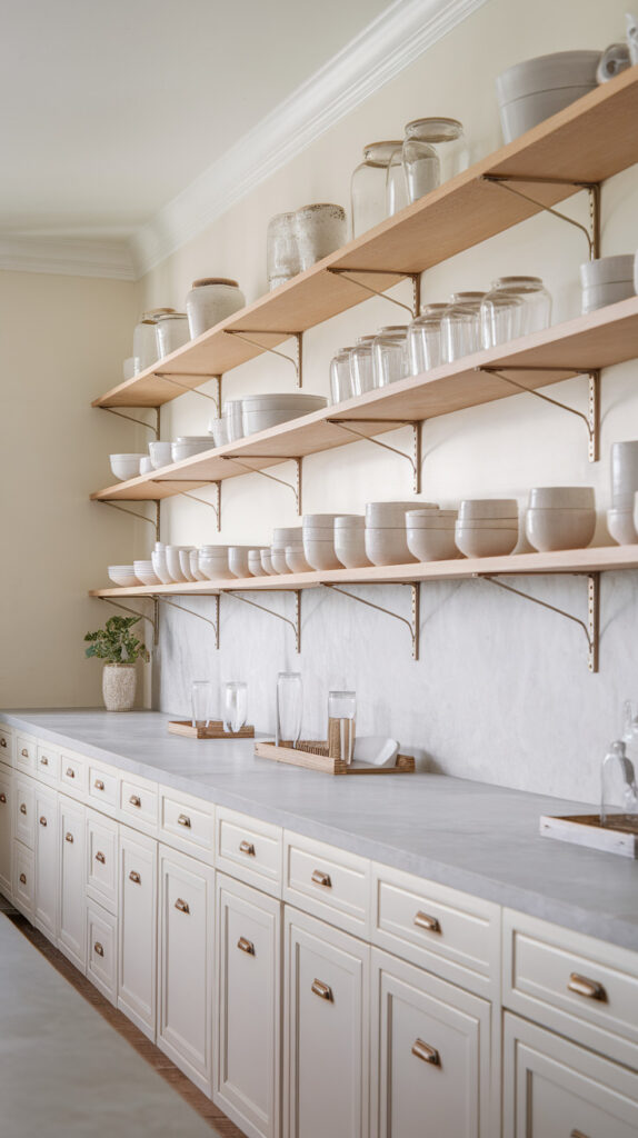 Open shelving reduces visual weight while still giving you accessible storage. The room feels wider because your eye isn’t blocked by solid cabinetry on both sides.