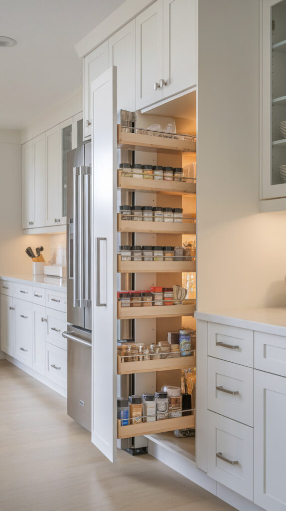 Slim pull-out cabinets use tight spaces efficiently.