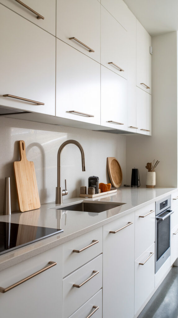 In narrow kitchens, clutter doesn’t just look messy. It reduces usable workspace and tightens the visual flow.