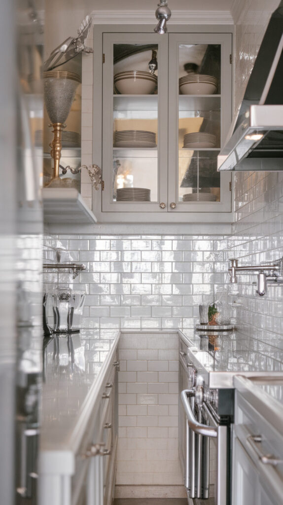 Mirrors aren’t just for living rooms. In narrow kitchens, reflective materials help bounce light around and reduce the boxed-in feeling.