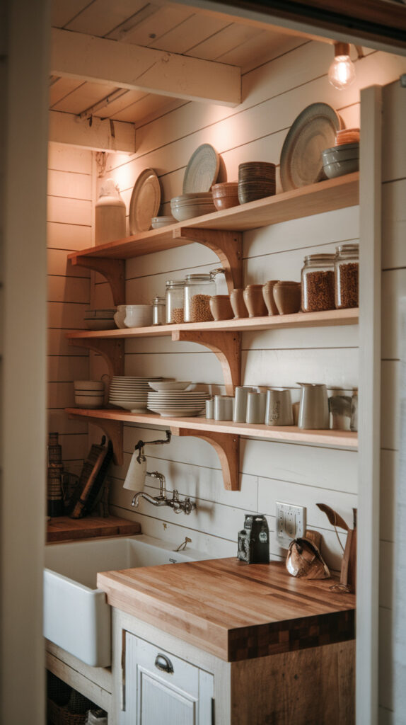 Wall space often gets ignored in small kitchens. Rustic shelving, hanging racks, and wall-mounted storage make excellent use of vertical space.
