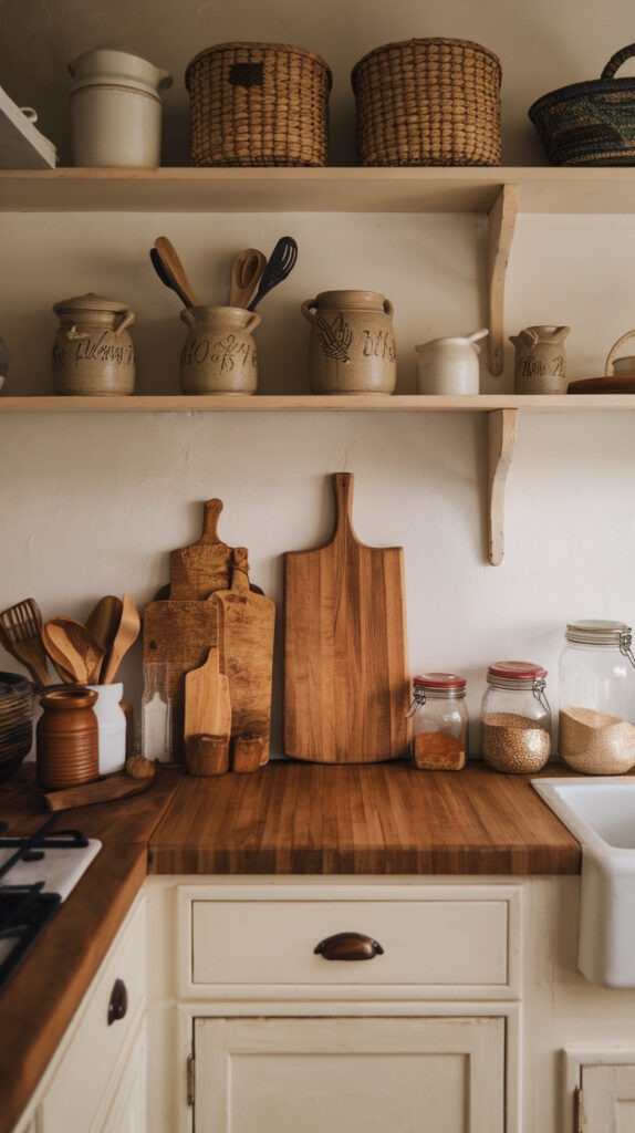 Even small touches matter. Wooden cutting boards, ceramic bowls, and woven baskets introduce warmth without requiring a full renovation.