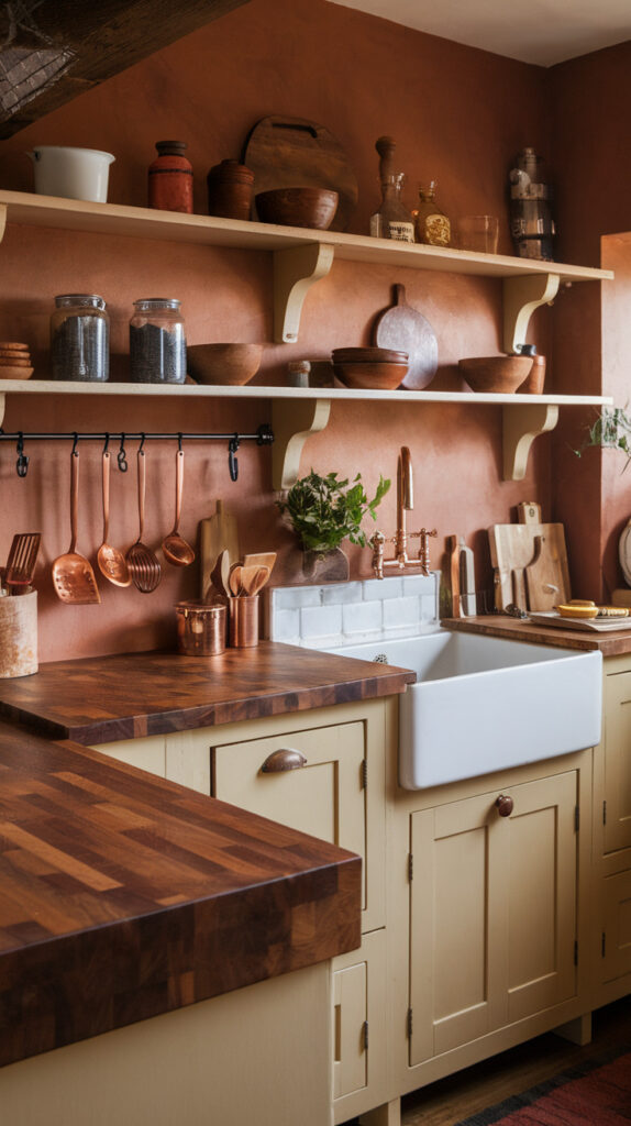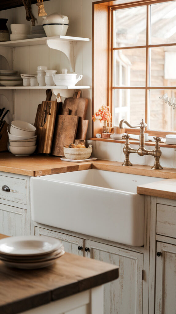 Pair butcher block with white or cream cabinetry for contrast. That mix keeps the kitchen feeling bright while still leaning into rustic warmth.