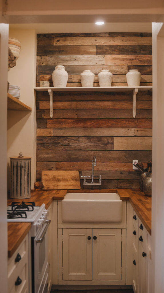 Plain drywall sometimes feels too flat for a rustic kitchen. Adding a reclaimed wood accent wall instantly introduces texture, warmth, and a handcrafted vibe.